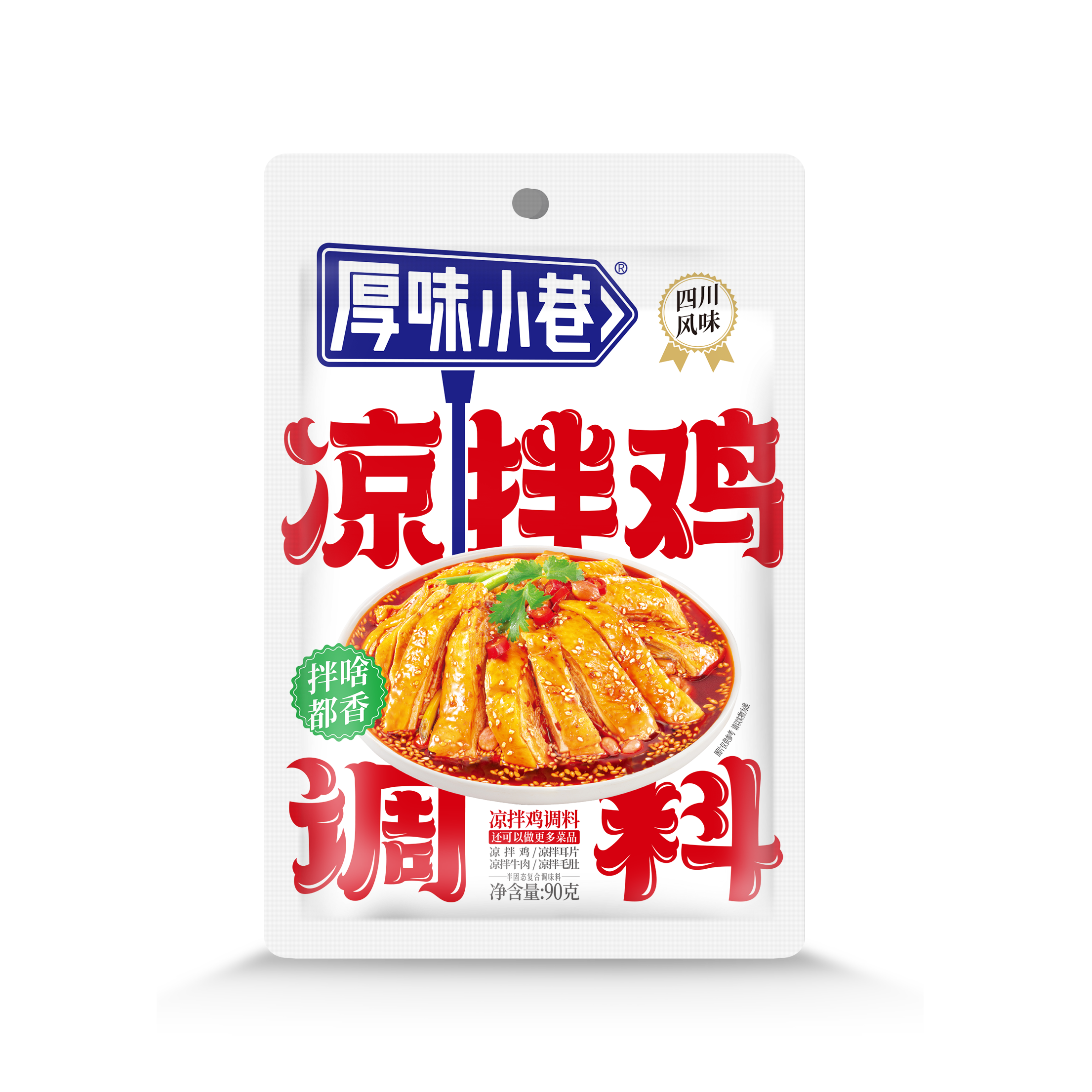 加入一袋90g厚味小巷凉拌鸡调料,依个人口味加入黄瓜丝、花生米、葱段等等其他配菜,最后拌匀即可